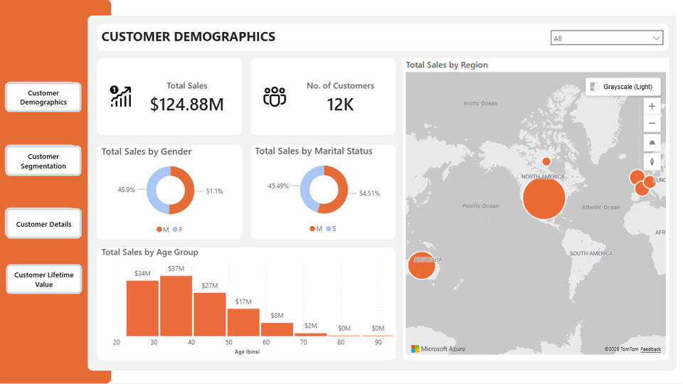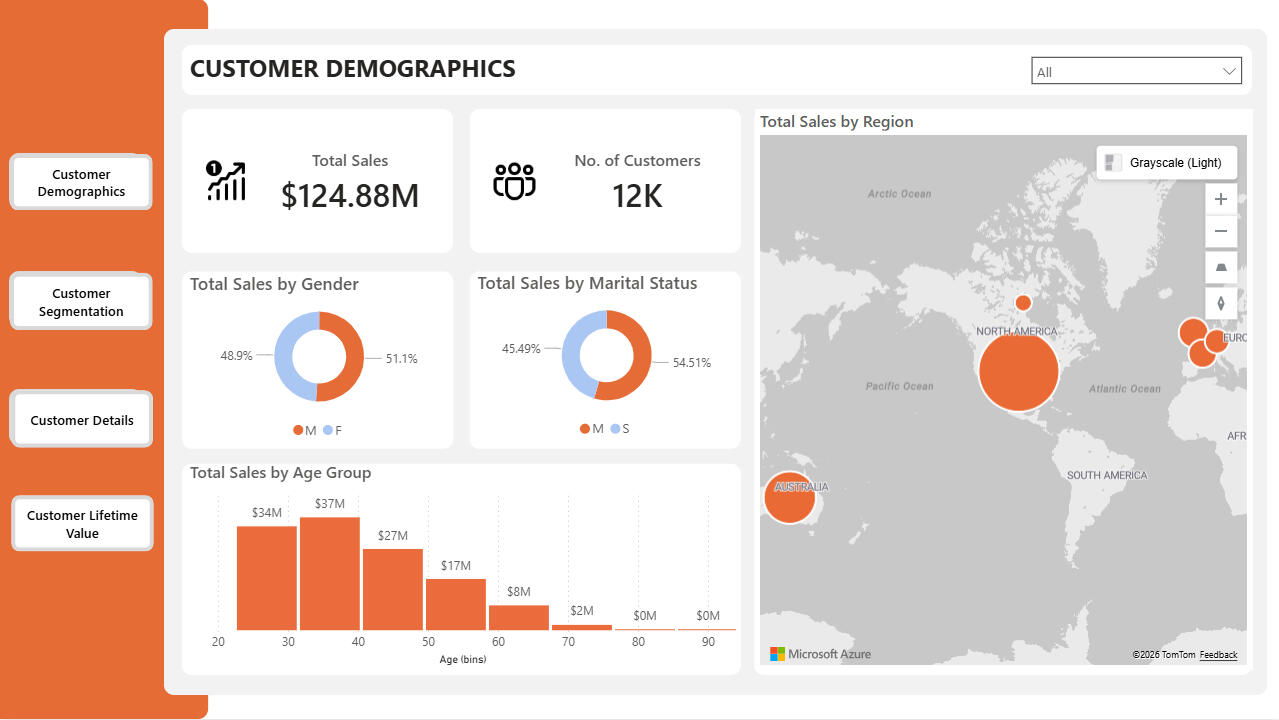 Sales split by gender & marital status, age‑band distribution, country map, product slicer, drill‑through support.Customer Segmentation (RFM)