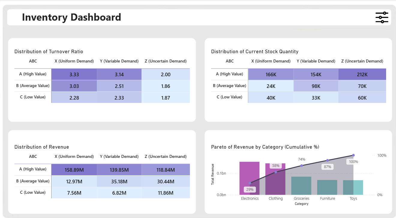 Interactive Power BI dashboard that consolidates inventory and sales data to visualize stock levels, inventory value, turnover, sell-through and days of inventory on hand. Includes UX features (filter pane with bookmarks, reset button), image-based stock status, and DAX measures to drive procurement and merchandising decisions