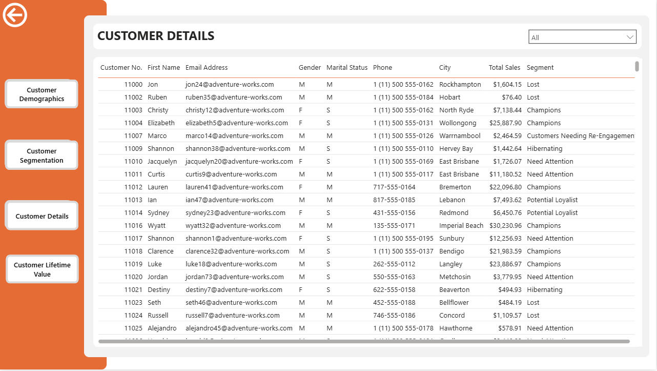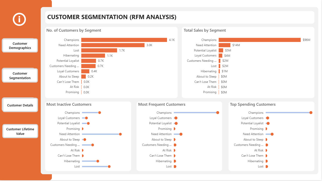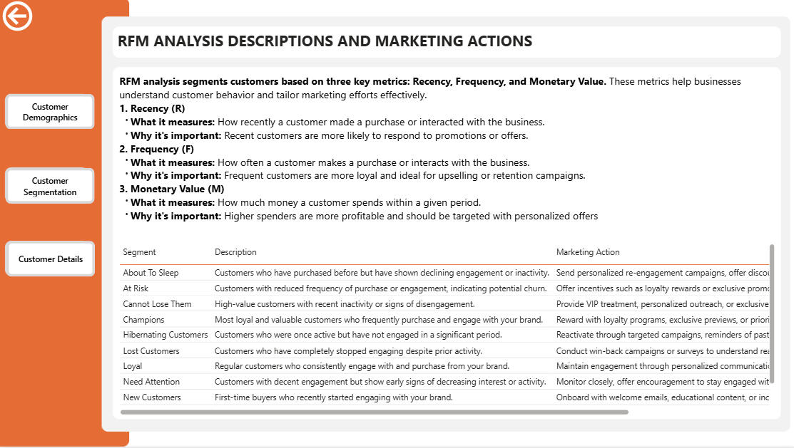 Customers + sales by segment, recency/frequency/monetary patterns by segment, “More info” segment definitions + actions.Customer Details