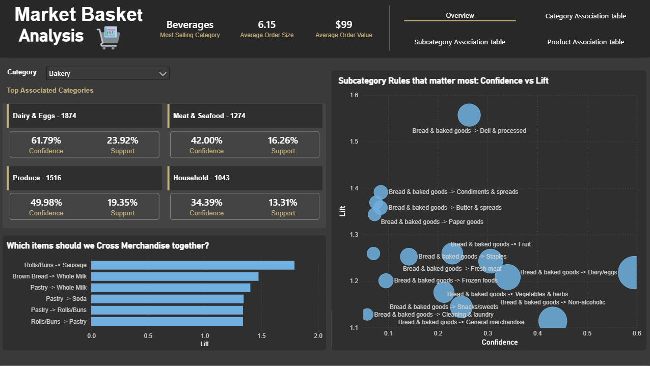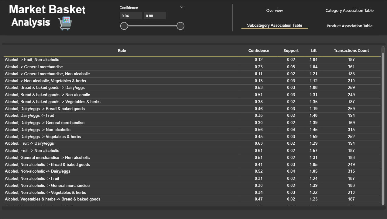 - Exportable rules table (sortable rule, confidence, support, lift, transaction counts).---Deliverables- Interactive Power BI report (PBIX + live demo embed).